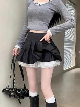 Women's Solid Color Pleated Polyester Skirt With Contrast Bow Decor, Stylish A-Line Skirt With Lace Trim, Side Zipper, High Waist, For Spring & Summer.
